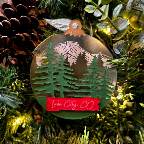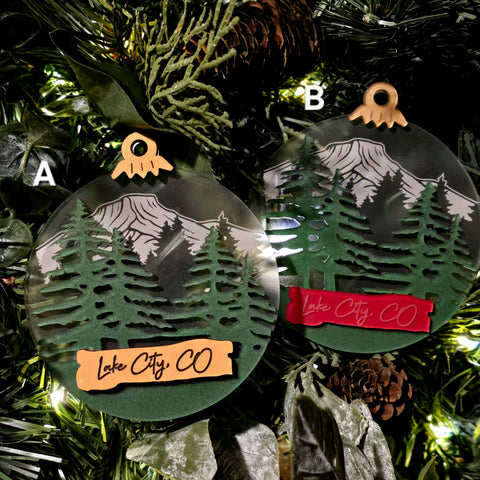 This version features a frosted clear acrylic base with layered green pines and a white mountain silhouette. The “Lake City, CO” tag is engraved on a warm wood accent at the bottom. Clean, soft lighting passes through the background and gives the ornament a gentle glow.